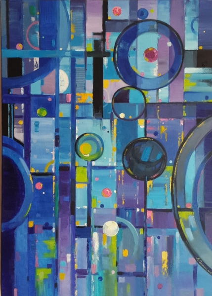 Абстракция маслом на холсте выполнена в космической тематике, в геометрическом стиле.