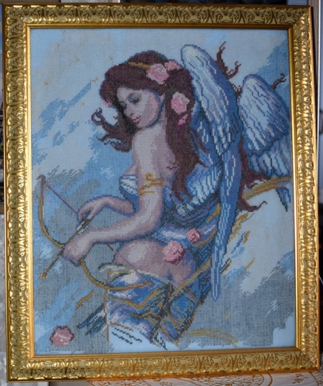Картина выполнена на цветной канве "Аида 16" мулине Madeira и DMC, в работе использованы металлизированные золотые нити. Вышивка оформлена в раму и находится под тонким стеклом.