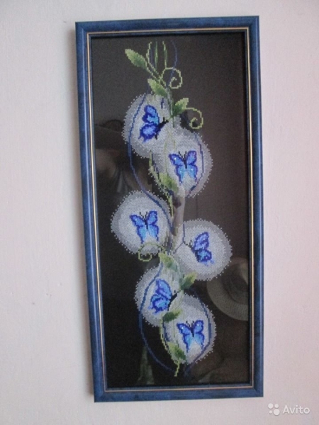 Ручная вышивка крестом. Вышивка с добавлением страз, бабочки вышиты бисером, рамка деревянная на заказ. Ореол вокруг бабочек выполнен светящимися нитками, в темноте светятся зеленым цветом. Прекрасно подойдёт к любому интерьеру, особенно к спальне, придаст романтичности и волшебства ночью.