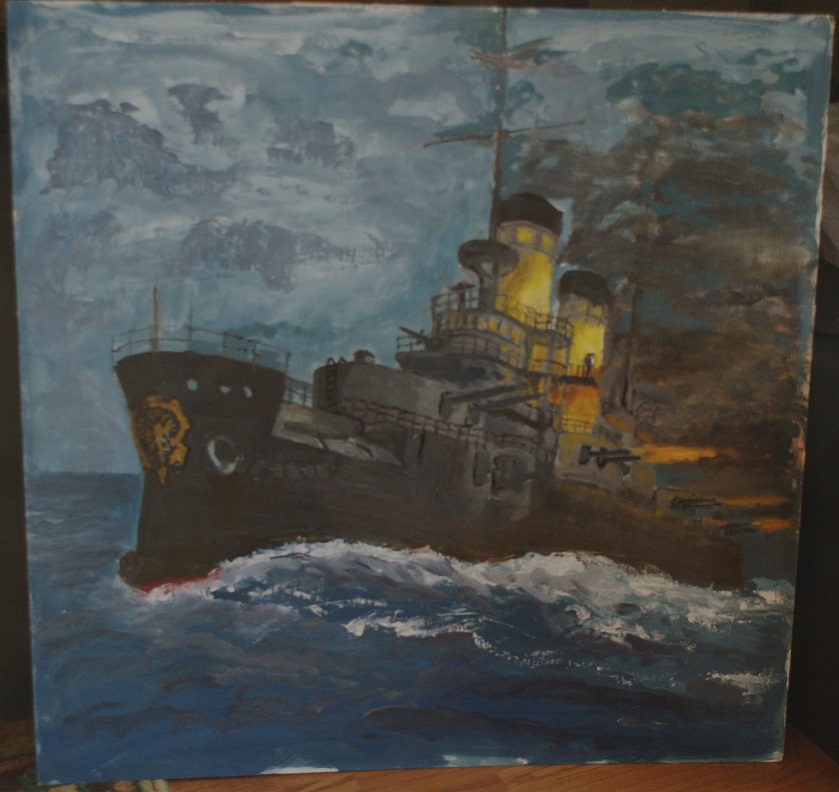 Картина излбражает бортовой залп ночью, при свете луны. котоый пробивается сквозь облака слева. Справа - отсветы орудийного пламени на надстройках и бортах. Окраска броненосца штатная для 1904 г - желтые трубы, черный корпус.