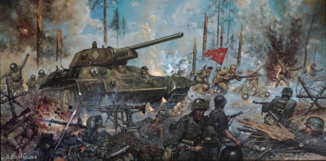 Коллега, у вас Т-34 с 85 мм орудием, такие появились только в 1944 г. Понятно, почему унтер кричит - такого шушпанцера он еще не видел, вот тевтоны и рванули кто куда...