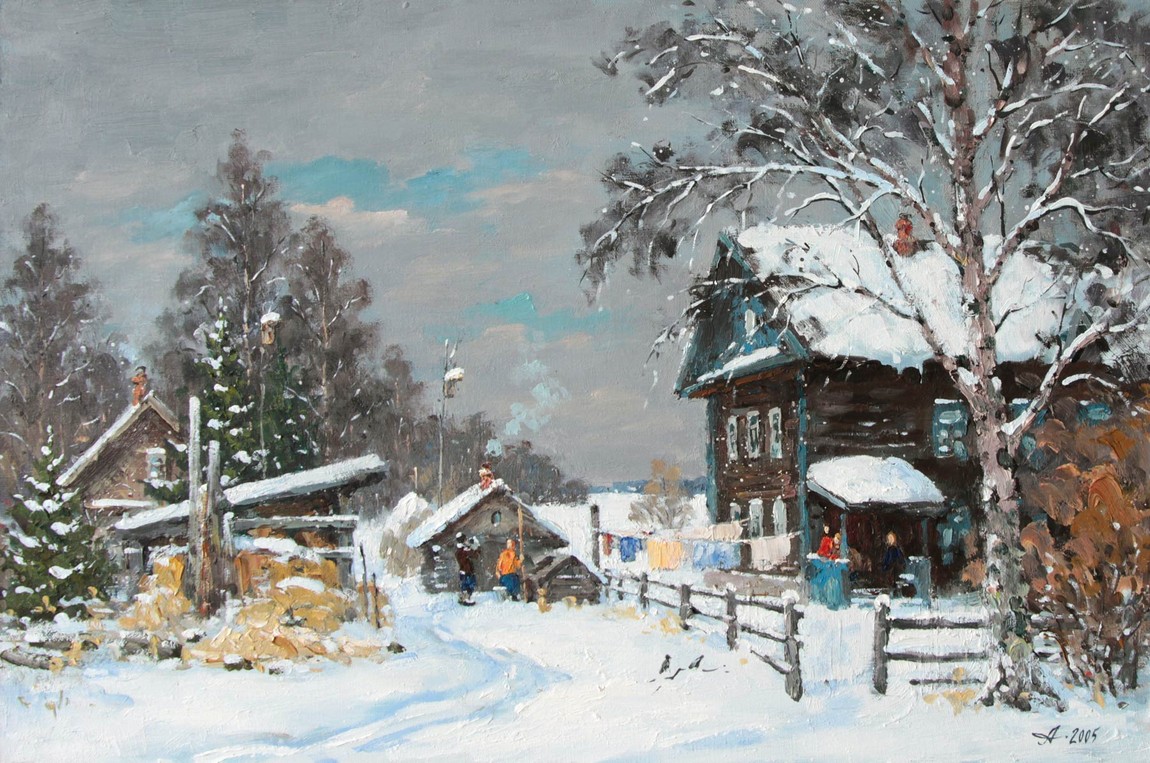 На этом зимнем пейзаже изображена улица в русской деревне Мишуково.