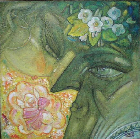 Колорит молодых людей и ветка яблони, выполнен в зеленой гамме,т.к. мы есть дети природы.Лицо мужчины