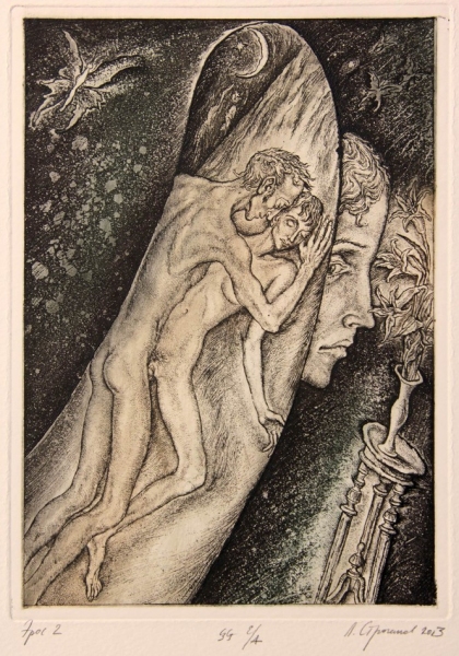 Офорт (C3). Акватинта (C5). Авторская ручная печать (E/A). Размер оттиска: 20х14 см. Размер бумаги: 39x29 см