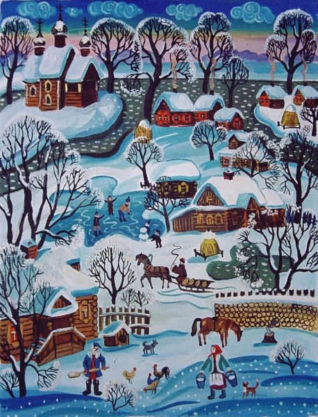 Зимний морозный февральский день в русской деревне. Дети лепят снежную бабу. Мужик убирает снег. Баба идет за водой. Лошадь, запряженная санями. Лошадь, дрова, курочки.
