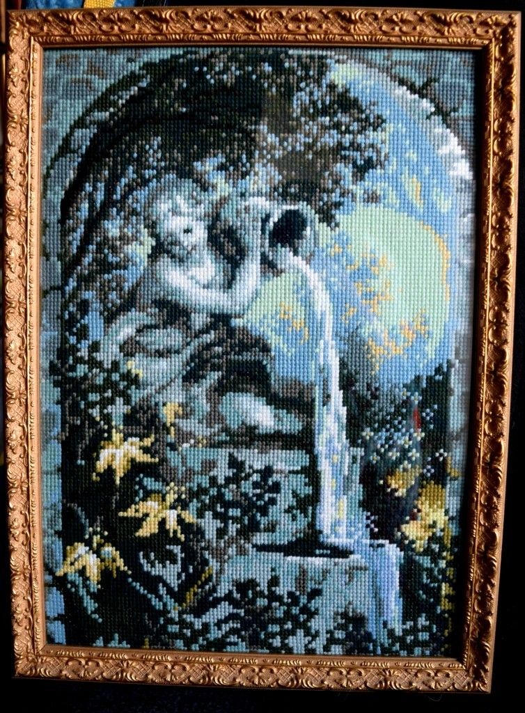 Работа выполнена на канве "Аида 14" акриловыми и шерстяными никами, оформлена в раму и находится под тонким стеклом