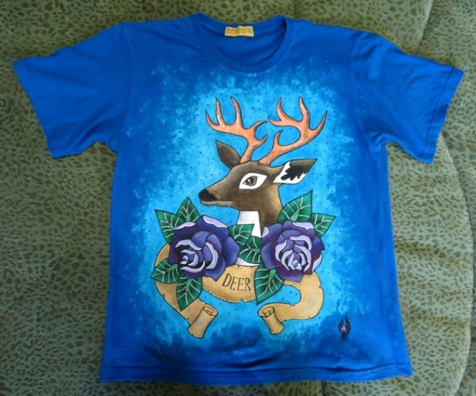 Это не батик, разделы сайта просто ограничены. Футболка - хлопок, рисунок выполнен с помощью акриловых красок по ткани и контурами. Разработка эскиза моя.