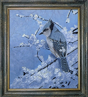 Работа выполнена с использованием авторской 3D техники (создан объемный, искрящийся снег), глаза птицы наблюдают за вами, когда вы перемещаетесь по комнате; глядя на картину создается впечатление, что это окно, а за ним зимние сумерки.