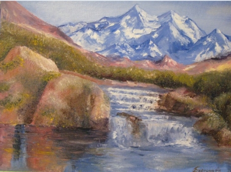 Синий снежные горы величественно возвышаются вдали. Сквозь зелень деревьев пробивается , спешит голубой студёный ручей. Веет прохладой.