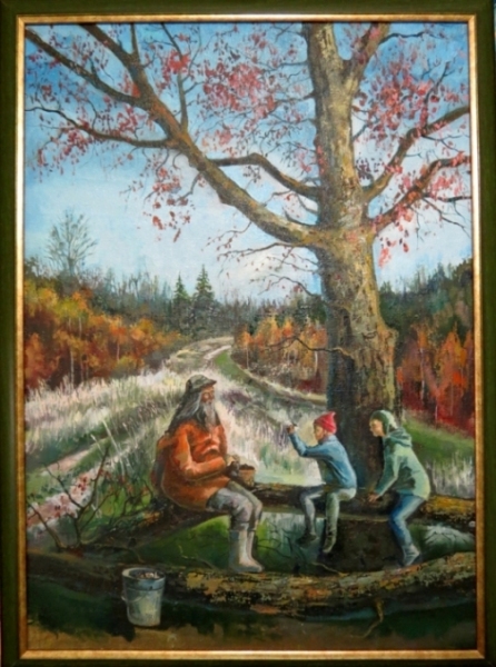 Работа оформлена в раму. За основу взят сюжет похода за грибами дедушки и двух внуков.