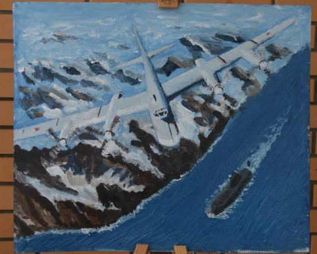 Эпизод "холодной войны" Вдоль берега Северного моря возвращаются на базу стратегический ракетоносец Ту-95 и ПЛАРБ "Акула" Оргалит 60 х 60 см, масло, в Москве, возможен пересыл по РФ + 500 р к цене