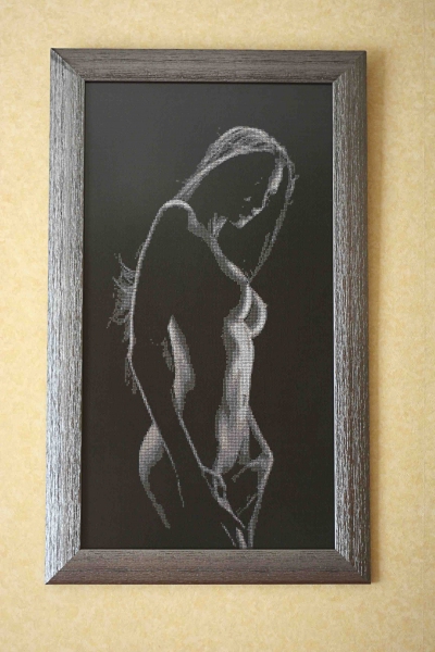 Работа выполнена по собственной схеме на черной канве с частичным заполнением. Рама пластик, стекло антиблик.