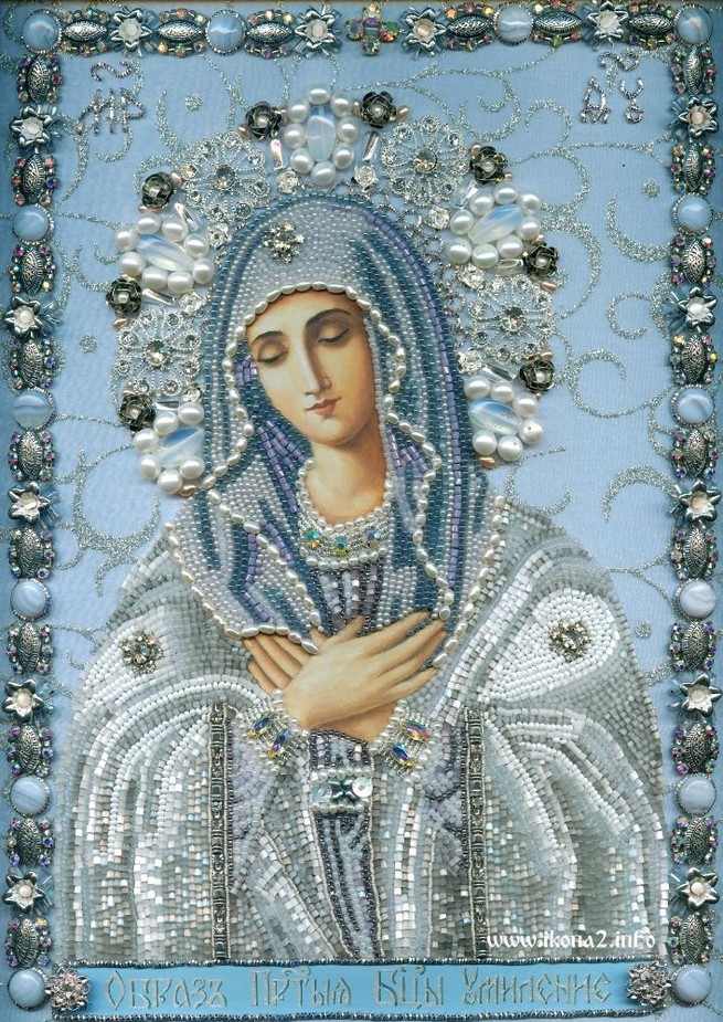 Материалы, использованные в вышивке иконы Богородицы Умиление: ткань атлас и органза, лики написаны маслом на тонком холсте, бисер, стразы, в том числе Сваровского, трунцал, канитель, жемчуг, лунный камень, агат