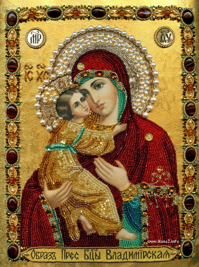 Материалы, использованные в вышивке иконы Богородицы Владимирская: ткань -лайк , лики написаны на тонком холсте маслом, бисер, канитель, стразы, трунцал, жемчуг, перламутр, янтарь, бирюза, бычий глаз, сердолик.