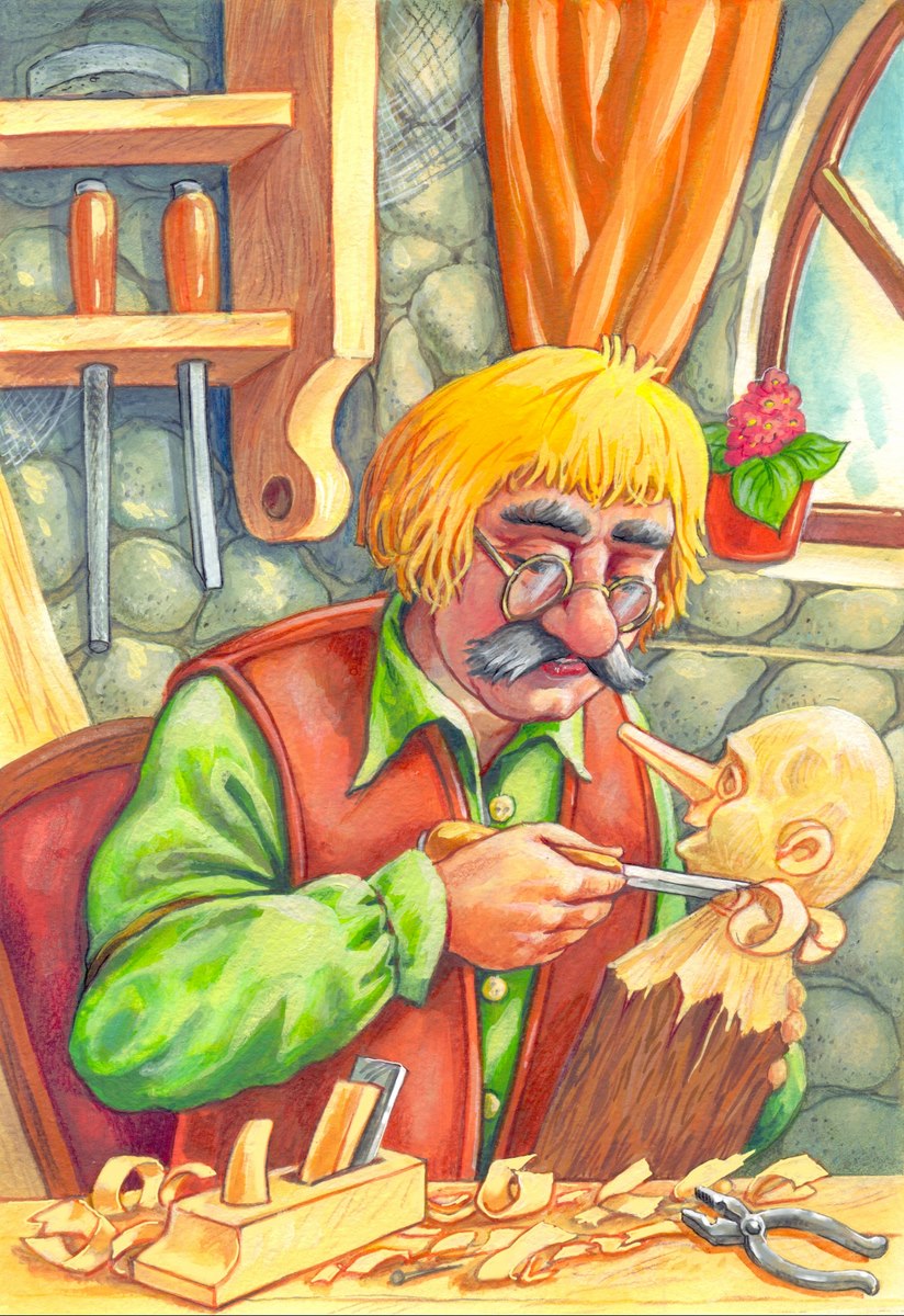 Иллюстрации к Пиннокио. Джеппетто вырезает куклу.