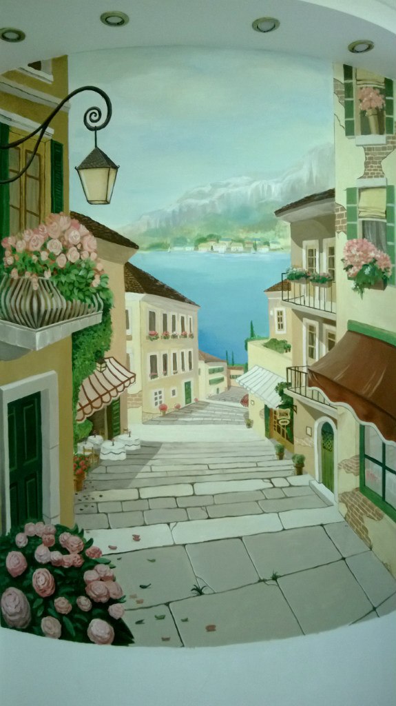 Роспись акрилом по стене в прихожей частной квартиры. Роспись выполнена в нише, с подсветкой. Возможно воплощение любого пейзажа