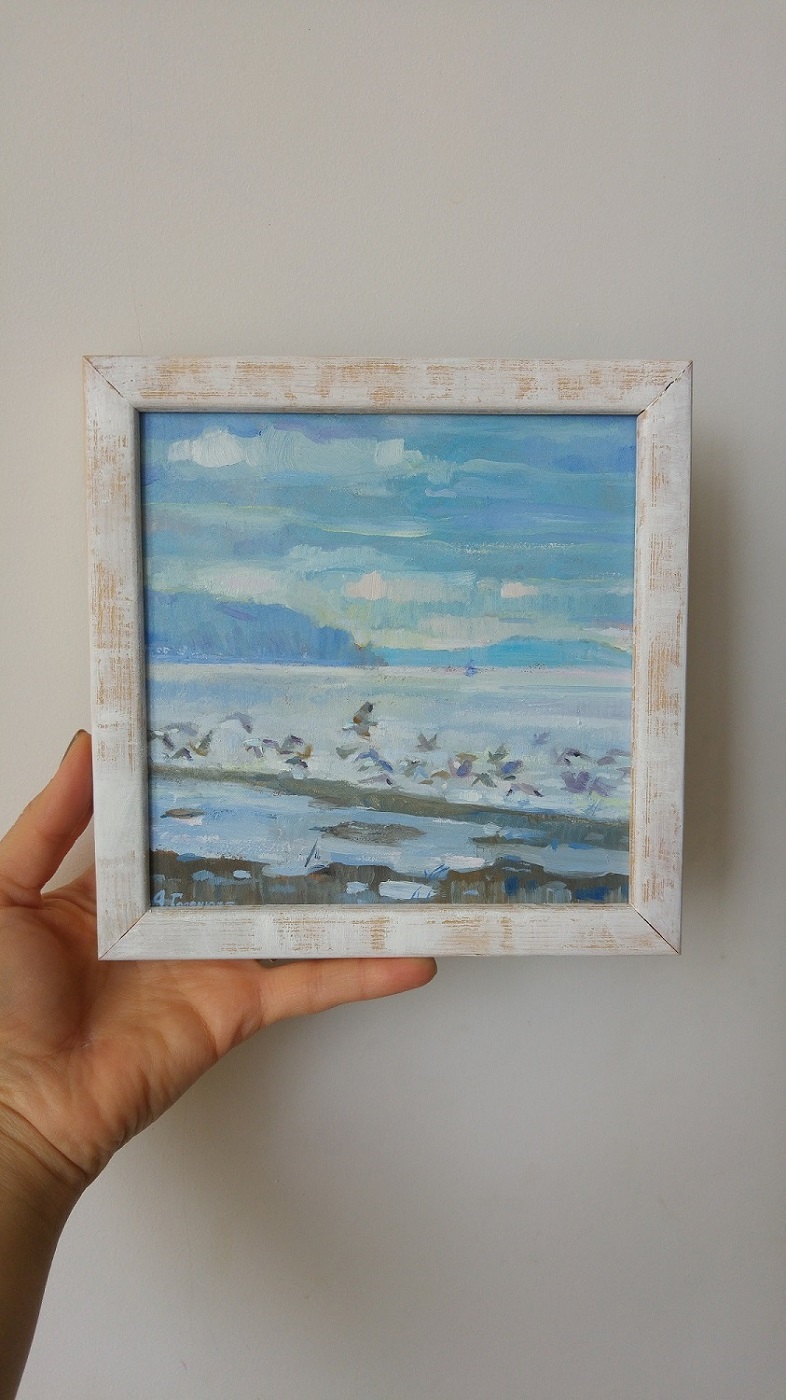 Крымский пейзаж с морем и горами в пасмурную погоду, вид на гору "Носорог" с летящими чайкамт вдоль берега.