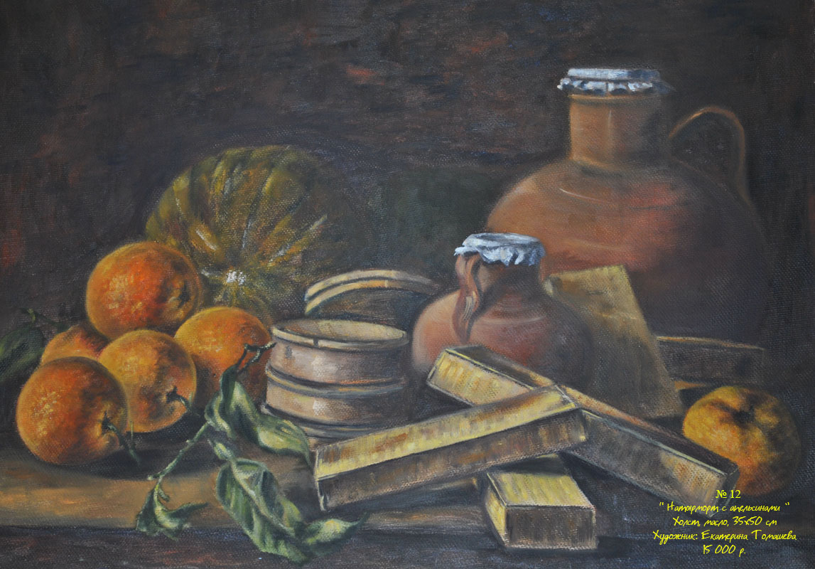 Ручная работа картина "Натюрморт с апельсинами" выполнена на холсте маслеными красками, размер картины 35х50. Также Вы сможете заказать любую картину по вашему вкусу: копию картины любого известного автора, картину по фото, воплотить любую свою фантазию, предоставив эскиз или образ.