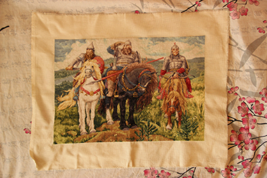 Картина "Три богатыря" вышитая по мотивам картины В.Васнецова. Вышитое полотно находится без багета.