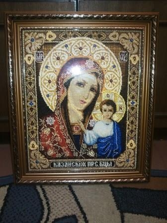 Икона выполнена из 39 600 шт. чешского бисера, количество цветовых оттенков - 56. Освещённая. Размер иконы с багетом 42*52см. Очень яркая, фотография не передает всей красоты. Оформлена в багетной мастерской и оснащена антибликовым стеклом.