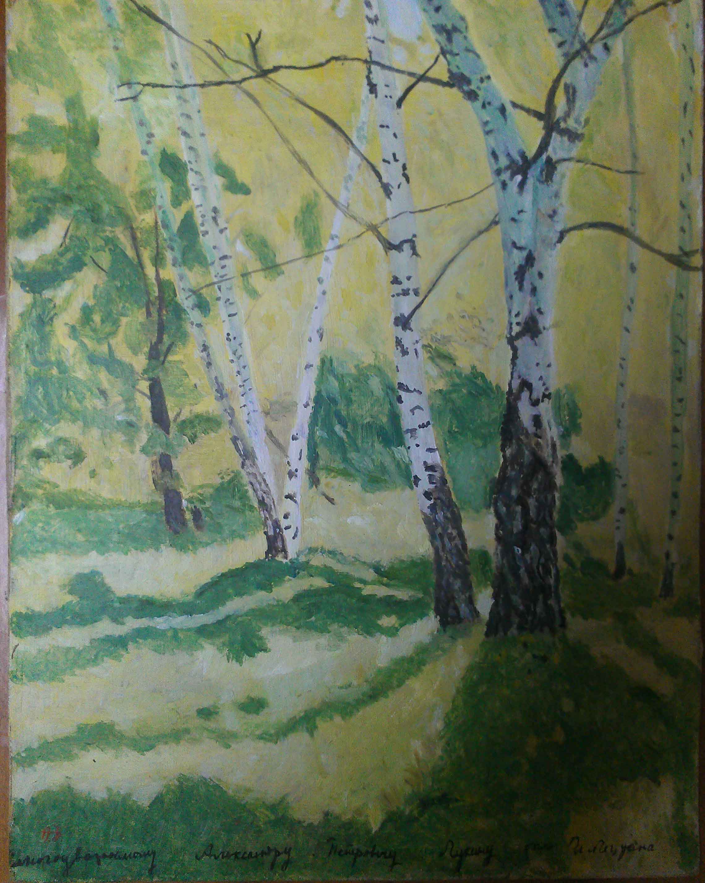 Копия этюда И.И. Левитана 1838 года "Березовая роща" (Холст, Масло), который хранится в частной коллекции. Эта копия выполнена Маслом на оргалите. Размеры копии :39,5x31 cm.