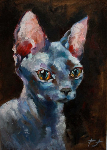 Картина маслом "Котенок сфинкс" выполнена в стиле импрессионизм с использованием мастихина.