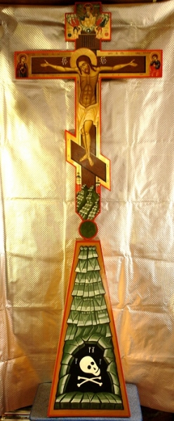 Крест-распятие с голгофой, может использоваться и как выносной крест на древке, древко водит внутрь голгофы. Минеральная темпера, золото, массив дерева, ручная авторская работа