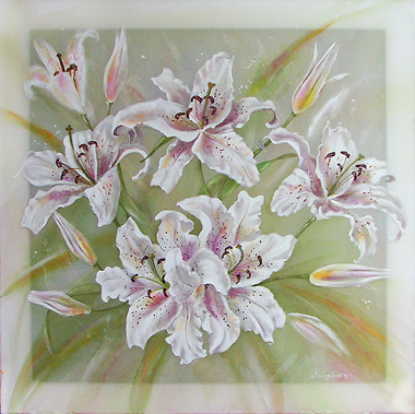 Роспись на прозрачном шелке, трехслойная картина: нижний слой-плотный шелк с абстрактным рисунком, второй слой-сетка с искорками, верхний слой- прозрачный шелк с изображением орхидей. Картина очень нежная...