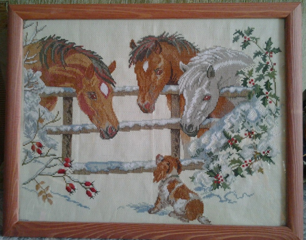 Картина вышита в ручную. Использована канва Aida 14 кремового цвета. Нитки "Hamma". Оформлена в багет + стекло.Техника исполнения: счетный крест.