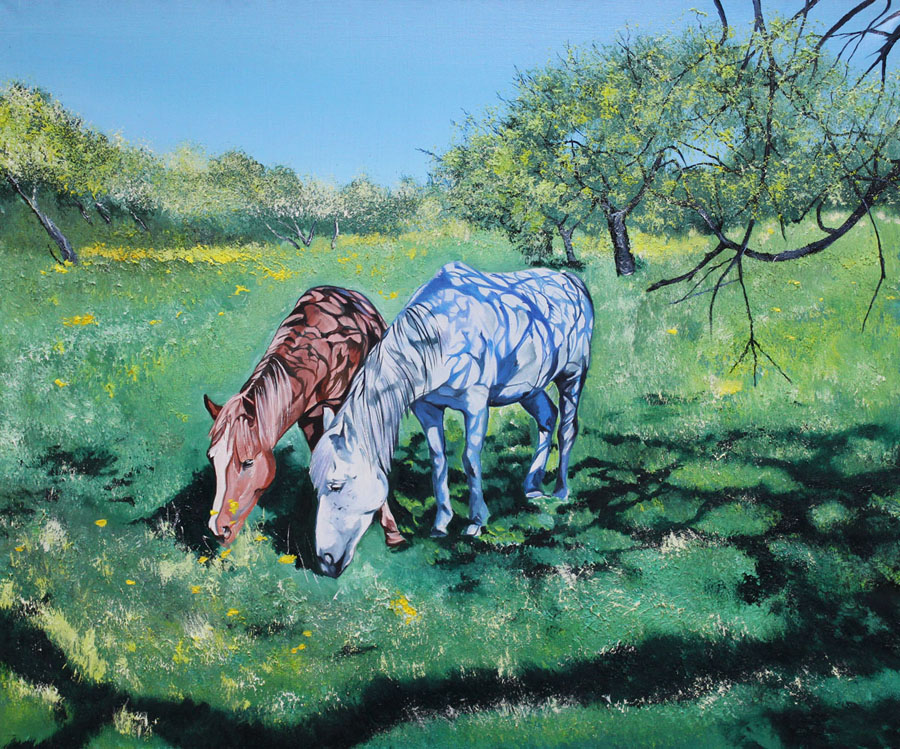 Лошади в яблоневом саду