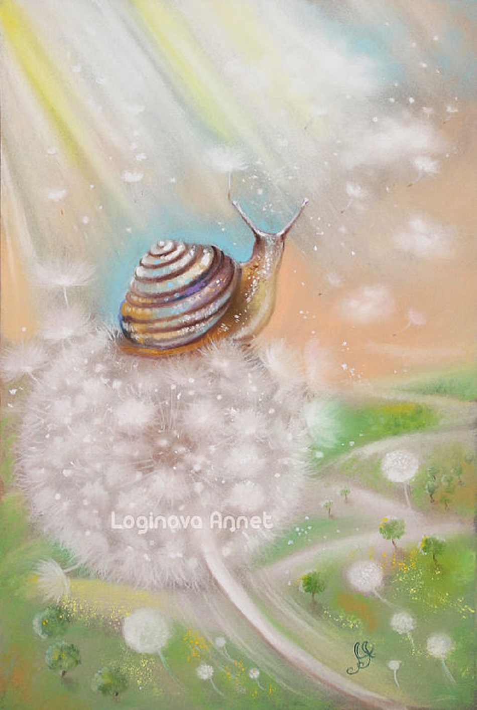 А позже...Теплым вечером улитка загрустила и мечтательно взглянув на небо, заснула... Звездным утром игривый теплый ветер нежно подхватил ее ложе - пушистый одуванчик, на котором она спала и взмыл вверх, навстречу пушистым облакам!