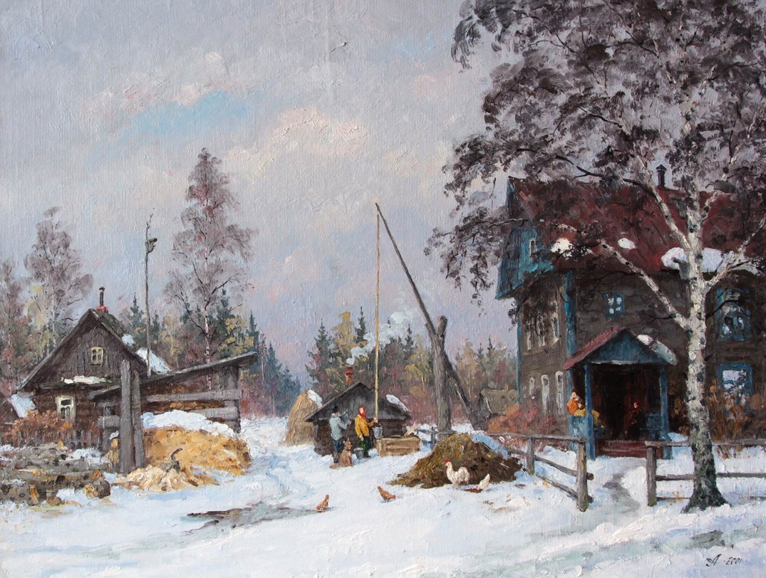 На этом зимнем пейзаже изображена улица в русской деревне Мишуково. Старые деревянные дома, колодец-журавль, курочки.