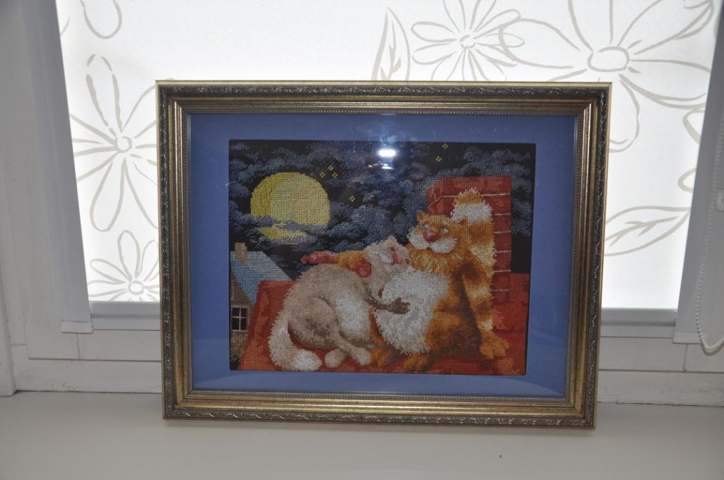 Работа выполнена в технике счетный крест и оформлена в рамку.В вышивке было использовано 30 цветов.Размер работы указан вместе с рамкой.