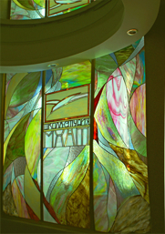 Тесное предверие школы-студии МХАТа оказалось необходимым прорвать энергией оптимистичных цветовых потоков,световых струй.Художественное стекло,роспись-витраж тиффани.