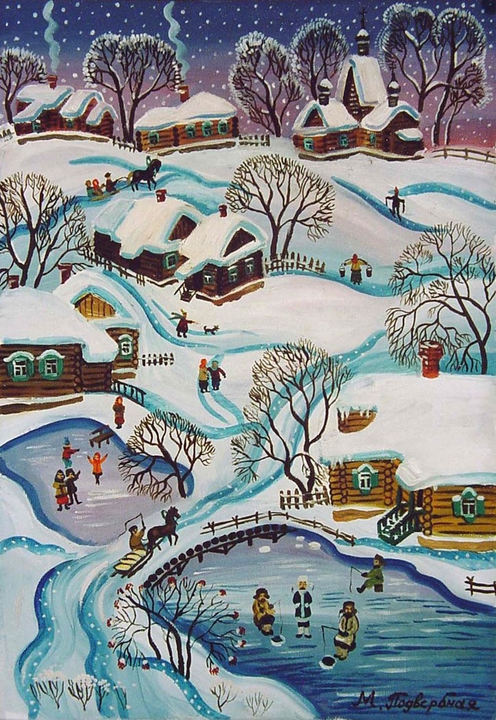 Зимний морозный день в русской деревне. Рыбаки ни речке ловят рыбу в лунках. Зимняя рыбалка. По мостику едут сани, запряженные лошадью. Баба идет за водой. Дети гуляют.