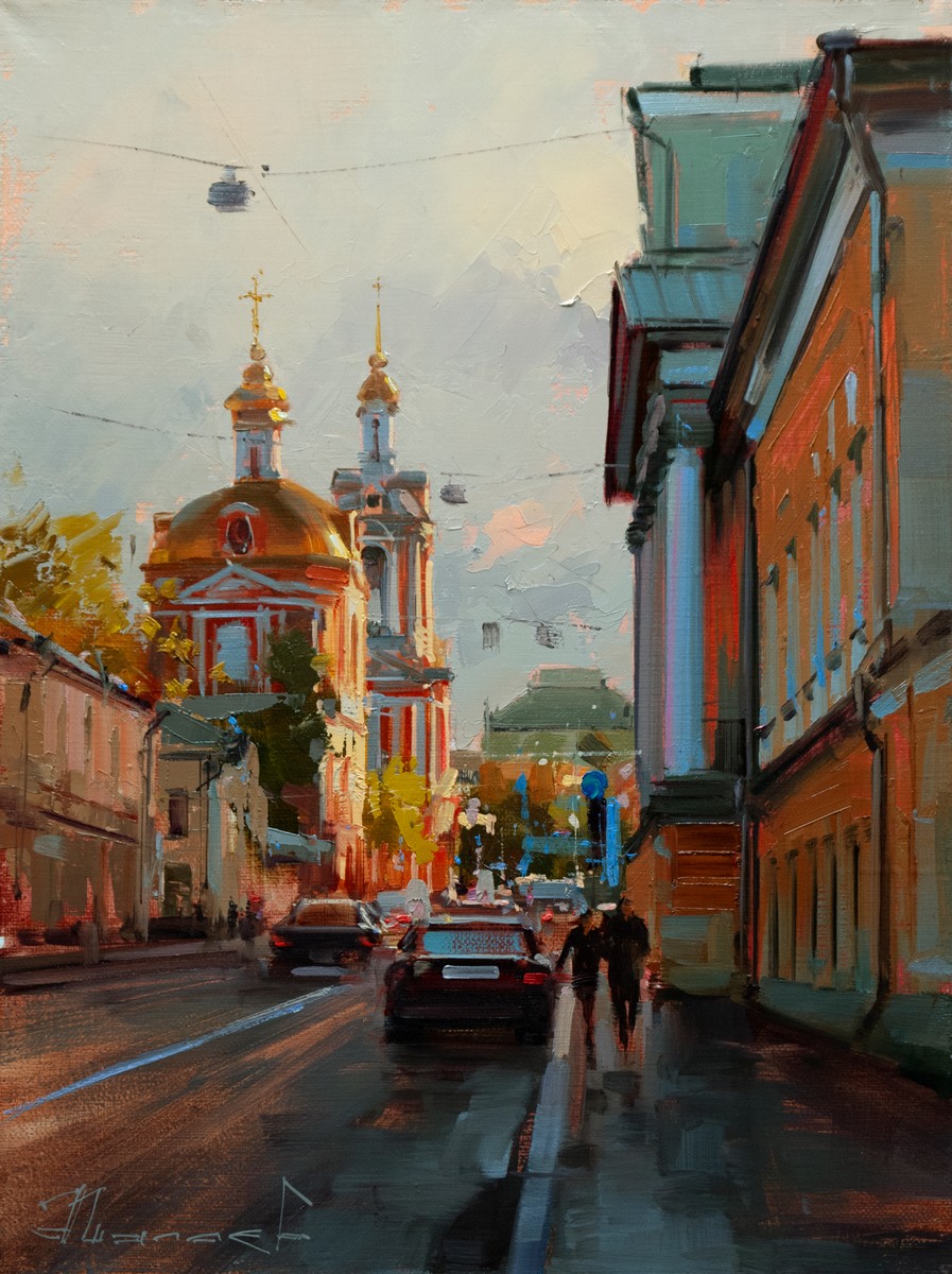 Моя обычная прогулка по Москве в поиске новых сюжетов в тот день затянулось до самого вечера, солнце уже пряталось за крыши домов. Конец июля, дневной зной спадал и домой совсем не хотелось, не смотря на усталость. Длинный маршрут проходил по району Басманный, одному из любимых мною уголков Москвы. И вот он, замечательный вид на храм великомученика Никиты в лучах, пробившегося между стенами домов закатного светила.