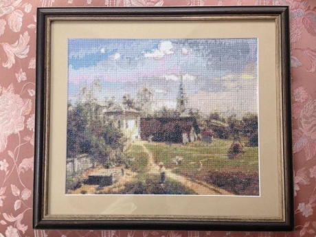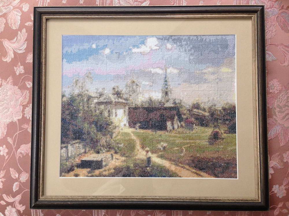вышитая картина по мотивам картины Поленова "Московский дворик" в багете.