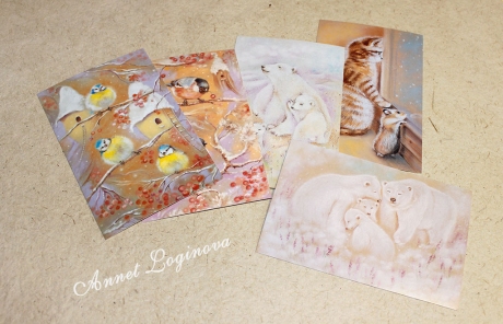 В наборе 5 штук. Поверхность бумаги открыток плотная и матовая, пастельных тонов.