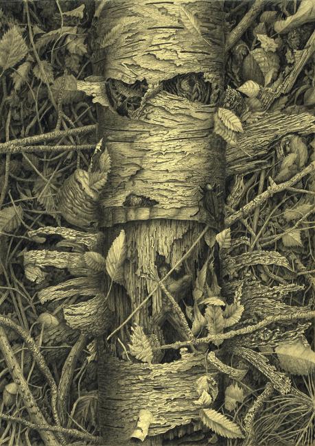 На данный момент, это, наверное, мой лучший рисунок карандашом. Нарисовал я его на цветной бумаге, эскиз сделал еще в лесу с натуры. Я замерз тогда и хотел уходить, но увидел поваленный ствол березы, который представился мне антропоморфным. Я понимал, что встретить в лесу такое дерево - большая редкость, поэтому сделал там эскиз и фотоснимок, по которому и рисовал рисунок. С другой фотографии я добавил сюда черного жука. В какой-то степени этот мрачный щелкунчик - жизнь, сжимающая тисками современного человека.