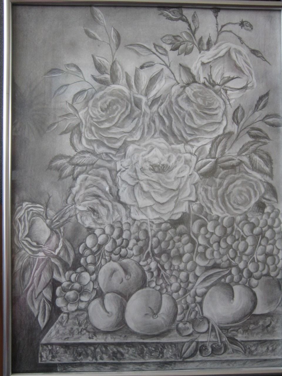 На картине изображены фрукты виноград, персики, так же видно многообразие цветов.