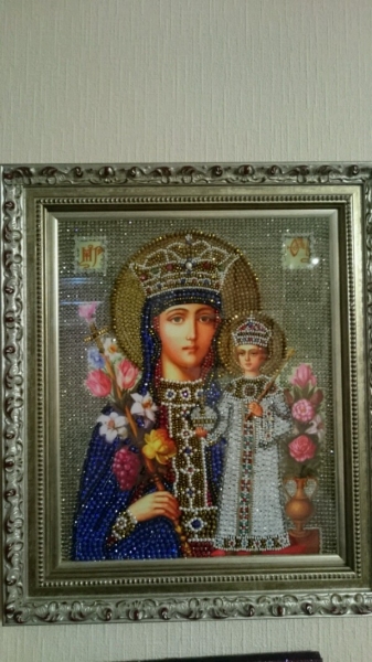 Икона вышита камнями, натянута на подрамник, вставлена в багет. Жемчуг, хрусталь, золотой трунцал, гематит, горный хрусталь. Под стеклом. Очень красиво сияет. 35000