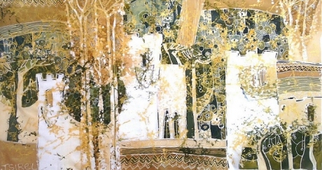 работа выполнена в технике горячий батик на натуральном шелке с использованием анилиновых красителей. Тяжелое песчаное солнце, белые стены старого города,золотой пейзаж.
