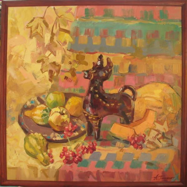 Осенний, красочный натюрморт в оранжево-желтом колорите. Несет в себе озорство, радость. Написана с натурной постановки.