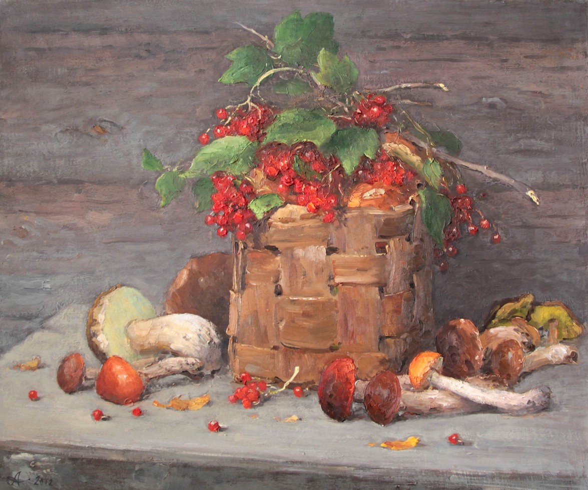 На этом деревенском натюрморте изображены простые, но щедрые дары русского леса: грибы и рябина.