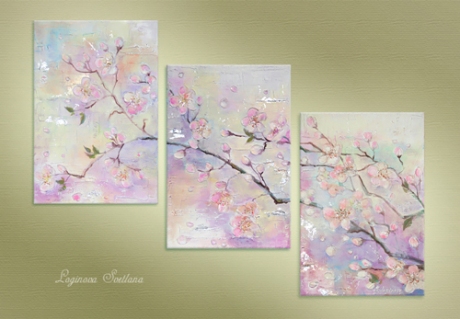 Триптих. Размер картин 20*30. Фон структурирован специальным грунтом. Цветы написаны также структурно специальной краской. Очень нежная и необычная картина украсит спальню, гостиную, а также офис.
