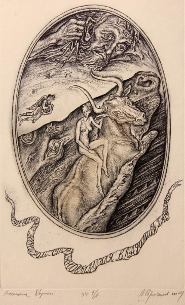 Офорт (C3). Акватинта (C5). Авторская ручная печать (E/A). Размер оттиска: 22х13 см. Размер бумаги: 39x29 см