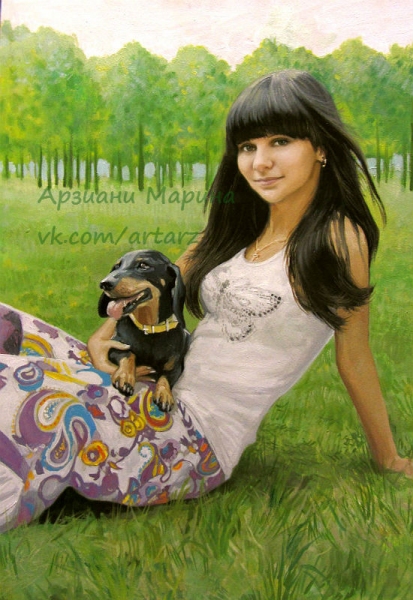 Воздушный летний портрет девушки с питомцем был выполнен по заказу одной из московских арт студий с фотографии клиента. Цены на аналогичный портрет уточняйте в личном сообщении.