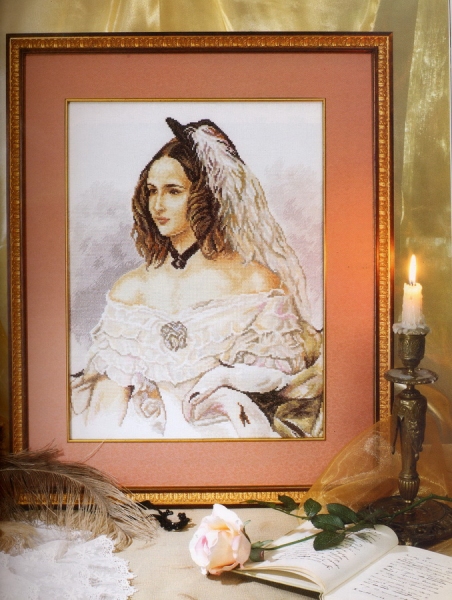 Портрет Натальи Гончаровой выполнен в технике счетный крест нитками мулине DMC на канве аида. Оформлен в деревянную раму-багет под стеклом.