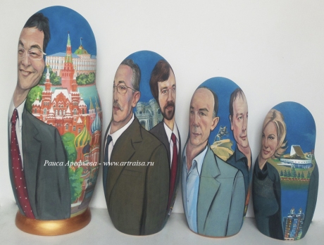 Матрёшка из 8 кукол с портретами 19 человек по кругу (по 2-3 портрета на 2-8 куклах, на первой - один портрет) на фоне городской архитектуры.