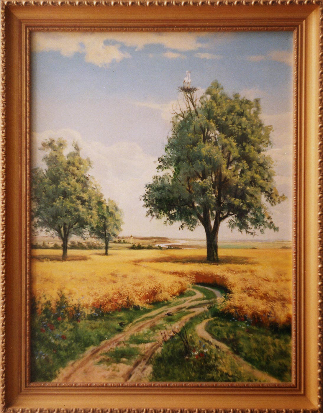 Дорога через пшеничное поле,аист на дереве ,ясный солнечный день-это жизнеутверждающий сюжет картины.Жизнь человека часто сравнивают с засеянным полем.Есть период сеяния .а потом наступает период жатвы,как итог прожитой жизни.